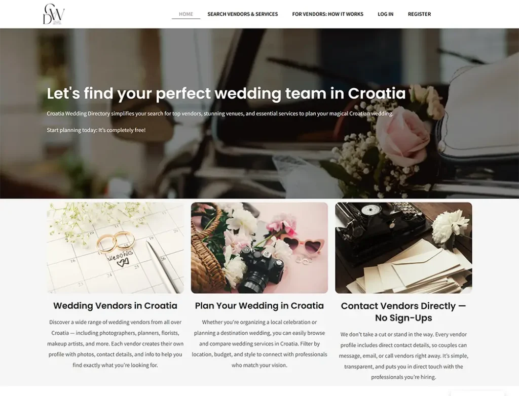 Platforma omogućuje mladencima da pronađu dobavljače i kontaktiraju ih direktno, a vendori sami kreiraju i uređuju svoje profile.